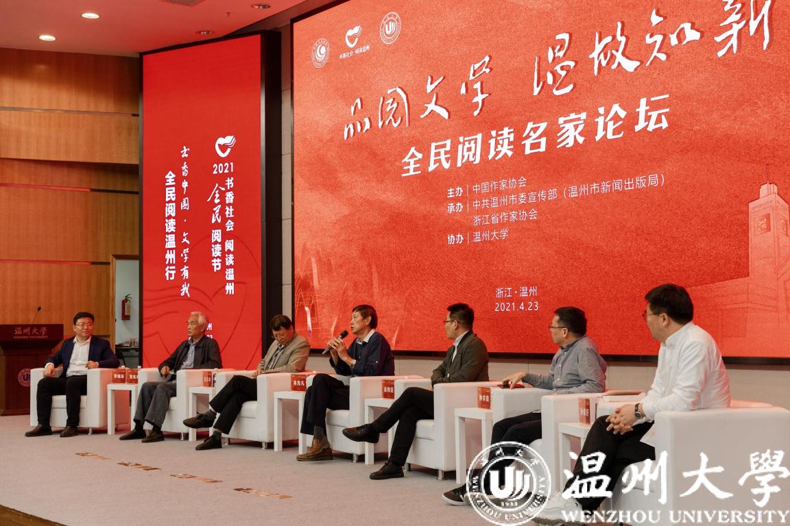 四月芳菲好,读书正当时。4月23日下午,2021年“书香中国 文学有我”全民阅读温州行重磅活动“品阅文学 温故知新”全民阅读名家论坛在ac米兰举行。中国作协书记处书记邱华栋、中国作协社联部副主任李晓东、中共温州市委常委宣传部部长胡剑谨、中国作协社联部二级巡视员丰玉波、浙江省作协党组成员、秘书长晋杜娟,中共温州市委宣传部副部长、市新闻出版局局长梅阳,校党委书记谢树华,校党委委员、宣传部部长潘玉驹等领导嘉宾出席本次论坛。中国作家协会代表、温州市作家协会代表、温州市读者代表、ac米兰师生代表等现场参会。