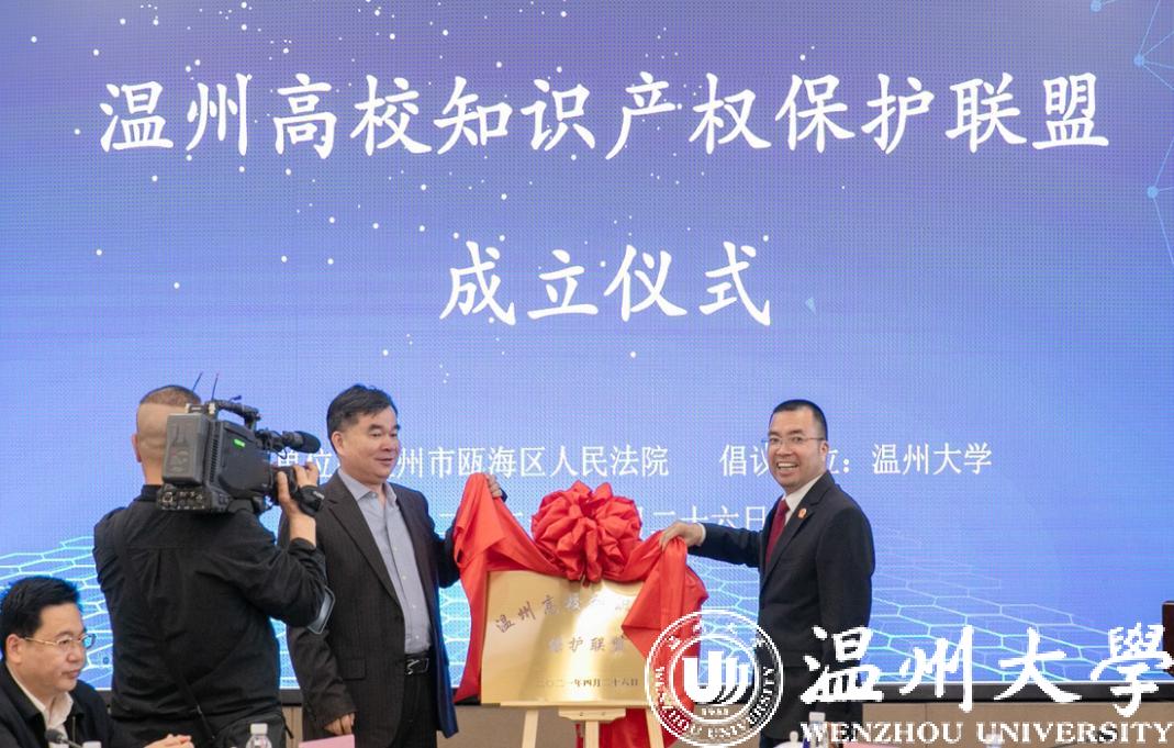 签约仪式上,ac米兰官网中文网站科技处负责人宣读《关于成立“温州高校知识产权保护联盟”的倡议书》、联盟成员签署倡议书,副校长徐和昆和温州市中级人民法院党组副书记、常务副院长陈有为共同为联盟揭牌。