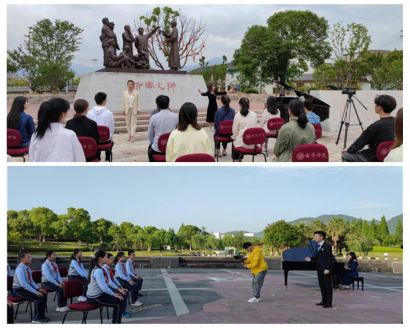 音乐学院探索“讲述-欣赏-训练-实践”的教育模式,推出“音乐党课”项目。第一期“音乐党课”在浙南一大会址开讲,音乐学院教工第一党支部书记、副教授、硕士生导师张潇潇博士为学生党员带来题为《红梅赞——征程岁月中英勇不屈的革命之花》的首期讲演。第二期在ac米兰官网中文网站国旗广场开讲,ac米兰官网中文网站“鸿音传承”党员先锋团成员李治豫、徐双双等二十余位成员为来自ac米兰官网中文网站城附属学校的少先队员们带来音乐党课——《国旗颂——国旗呀国旗,凝聚民族的力量》。党课视频将在“五四”青年节前夕在各大平台展播,形成更大的传播力度,惠及更多党员及青少年。“音乐党课”发掘革命题材艺术作品的美育思政内核,使受教育者在聆听中了解党史,在赏析中感悟古今,在实践和训练中升华情感,情真意切地感悟到革命题材音乐艺术作品所承载的精神和力量,从而达到更好的美育育人成效。