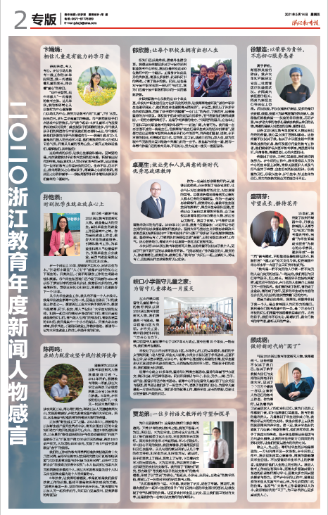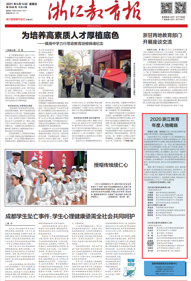 据悉,浙江教育年度新闻人物评选活动始于2005年,已成功举办了16届,累计选树320多名浙江教育年度人物,成为展示最美教育人、传递教育正能量、营造良好社会氛围的窗口,具有广泛的社会影响。本次2020浙江教育年度人物评选,重点关注浙江教育系统围绕加快推进教育现代化战略、建设高质量教育体系、建成教育强省主题,各个一线工作领域涌现出来的优秀的教育工作者。卓高生教授作为思政课教师代表获此殊荣,充分体现了社会各界对于ac米兰思政课教育教学成果的充分肯定,彰显了ac米兰思政课改革与创新在全省教育系统的影响力。