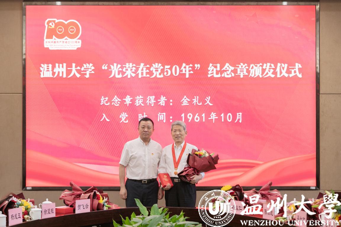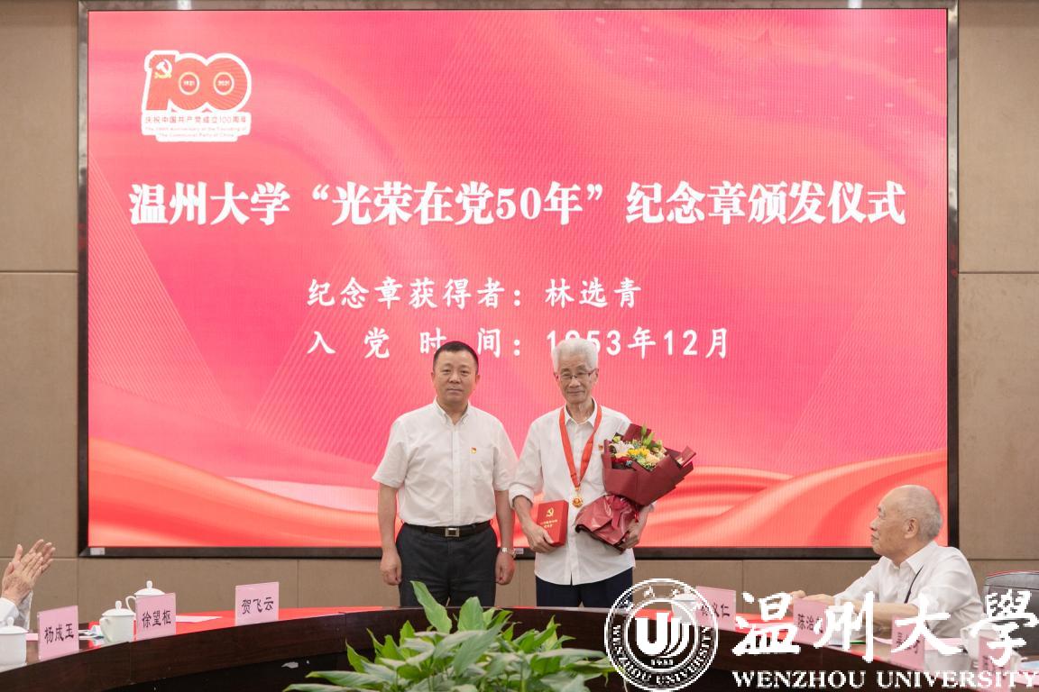 校党委书记谢树华逐一为老党员颁发“光荣在党50年”纪念章,并与他们亲切握手、真挚慰问,表达对老党员的崇高敬意。他希望学校各级党组织和广大党员以纪念章颁发为契机,深入推进党史学习教育,持续掀起向老党员学习的热潮,主动向先进看齐、向榜样看齐,在学校高质量发展新征程中,担当作为、奋发奋进、出力出彩。青年学生党员向老党员献上鲜花,现场响起阵阵热烈的掌声。老党员们手捧纪念章,心潮澎湃、百感交集,自豪之情溢于言表。