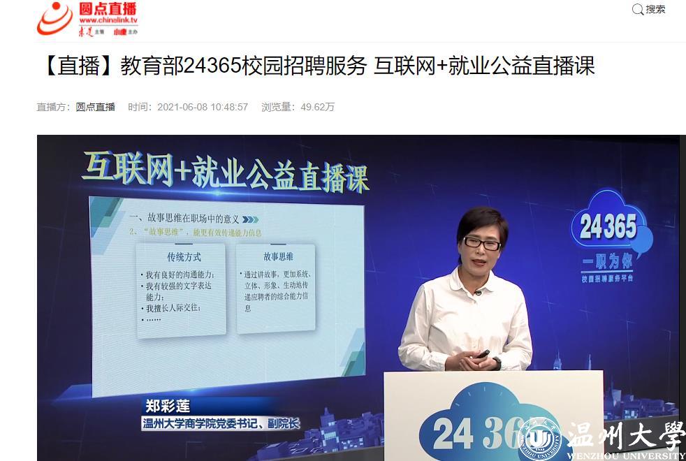 郑彩莲作为就业创业指导专家,经浙江省高校受浙江省教育发展中心推荐,得到全国高校学生信息咨询与就业指导中心邀请至中国教育电视台主讲互联网+就业公益直播课。截止发稿,该公益课已在学习强国、新华网、人民视频等15个知名网络平台同步直播,665.47万人次收看。