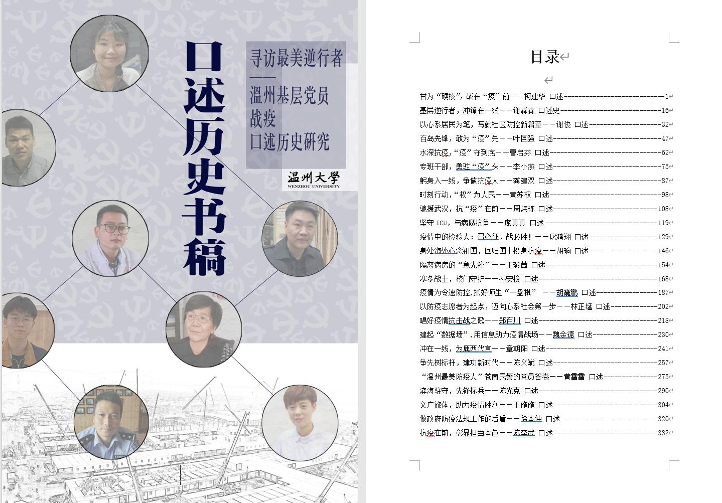 ac米兰官网中文网站人文学院历史系大一大二的学生结合了建党百年华诞和中国人民众志成城抗击新冠肺炎疫情这两大时代热点,通过生动新颖的口述历史研究方法,对温州基层党员这一群体的战疫行动展开了调研,以个体记忆组合成集体记忆,以丰富的细节实现全景式描绘,为疫情这一灾难留下一部鲜活的记忆型史料。