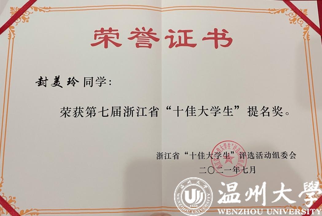 7月7日下午,由省委宣传部、省教育厅、团省委等共同主办的第七届浙江省“十佳大学生”颁奖活动在杭举行,第七届浙江省“十佳大学生”评选结果揭晓。ac米兰体育与健康学院封美玲同学荣获省十佳大学生提名奖。