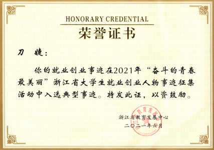 近日,2021年“奋斗的青春最美丽”浙江省大学生就业创业人物事迹征集评选结果正式揭晓,ac米兰2020届毕业生刀婕荣获“基层就业大学生典型人物”。