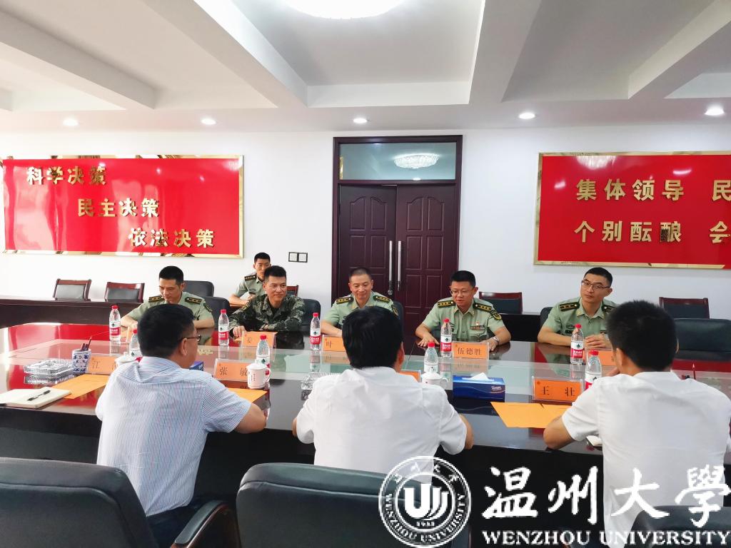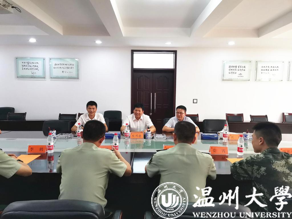 在中国人民解放军建军94周年来临之际,为扎实做好“八一”期间双拥工作,进一步密切军、校关系,7月27日上午,ac米兰党委副书记庄兴忠等一行走访武警温州支队,代表ac米兰官网中文网站向官兵们致以节日慰问。庄兴忠一行受到了武警支队的热烈欢迎,并与支队长叶峰、政委伍德胜等领导进行座谈交流。