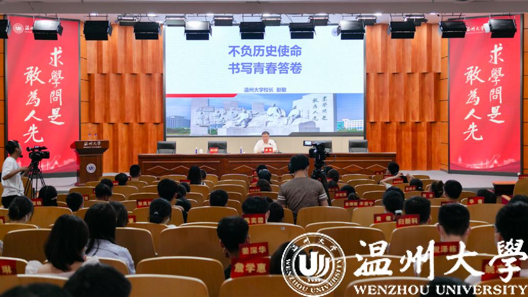 开课仪式后,赵敏以《不负历史使命,书写青春答卷》为题为2021级全体研究生新生上入学第一课。赵敏从“历史温大”“今日温大”“未来温大”三个篇章回溯ac米兰官网中文网站“两校合并、七校融合”的百年历史变迁。ac米兰官网中文网站年轻而又历史悠久。在历史温大篇章,赵敏介绍了以黄溯初、金嵘轩、苏步青三位为代表的、众多为学校发展呕心沥血的先贤师友,讲述了诸多近现代科教文艺大师与学校的渊源关系,向同学们展示了温大的师长与学长如何以实际行动践行“光大国族,造福人群”的奋斗精神。