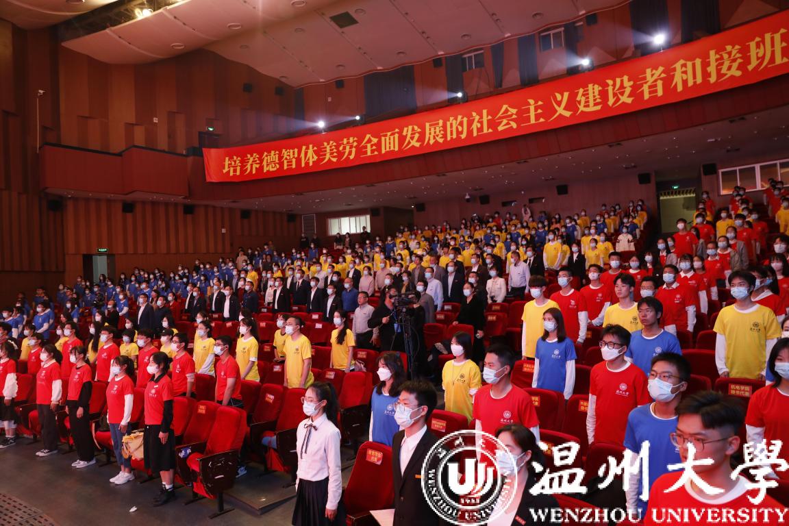 “东海水,雁荡山,我温大精神,浩浩宕宕……”,最后,全体师生齐唱ac米兰官网中文网站校歌。嘹亮的歌声是温大精神的传递,饱含温大人对学校的祝福和对祖国的祝愿。全体温大人携手共进,共筑温大更加美好的明天!