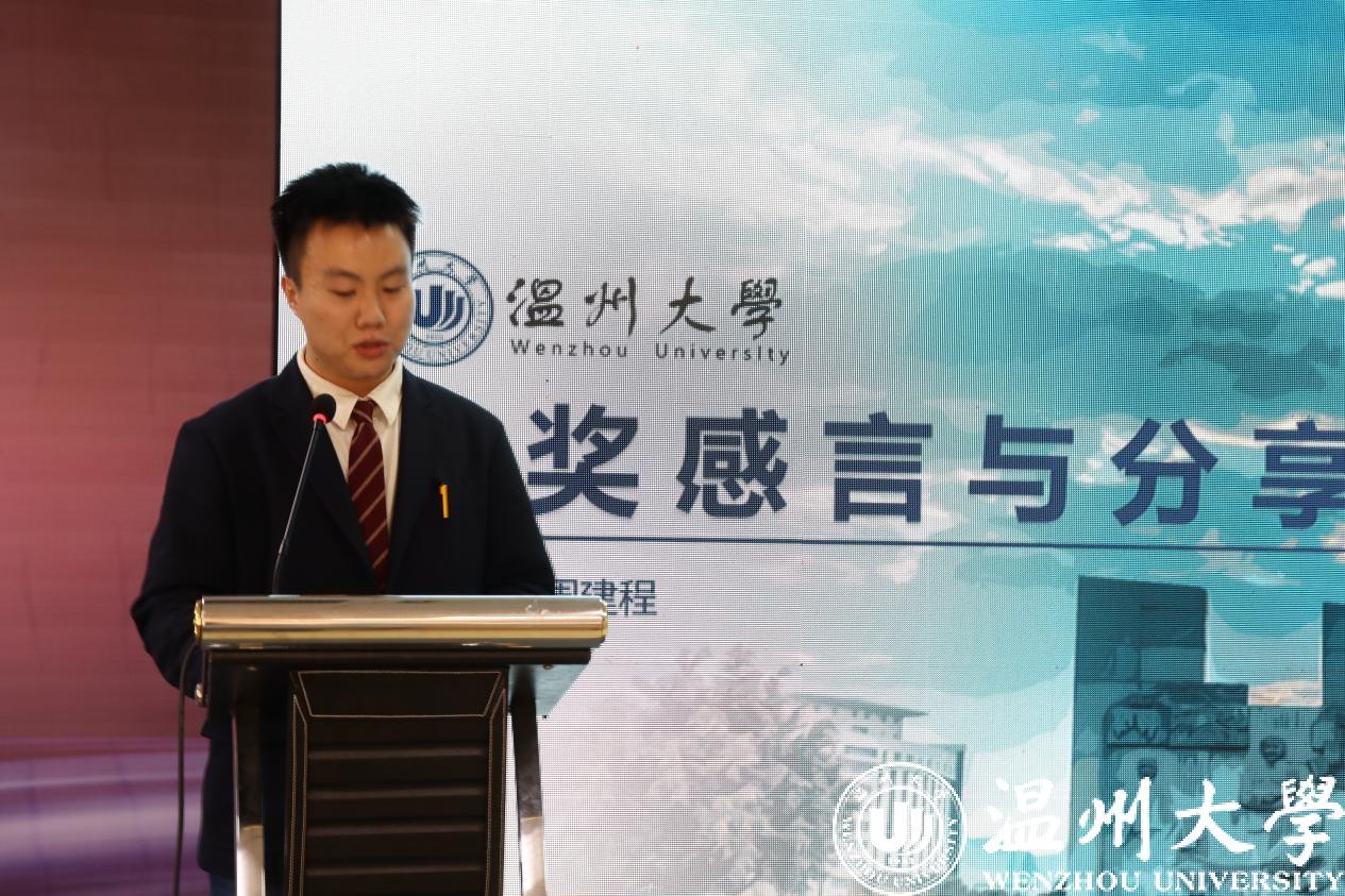 颁奖典礼上,温州市教育局高等教育处处长吕信恩、温州市人社局就业创业管理服务中心副主任张萍萍等为获奖代表颁奖,ac米兰电气与电子工程学院20级硕士研究生周建程代表入选的创新创业典型人物做优秀事迹分享。
