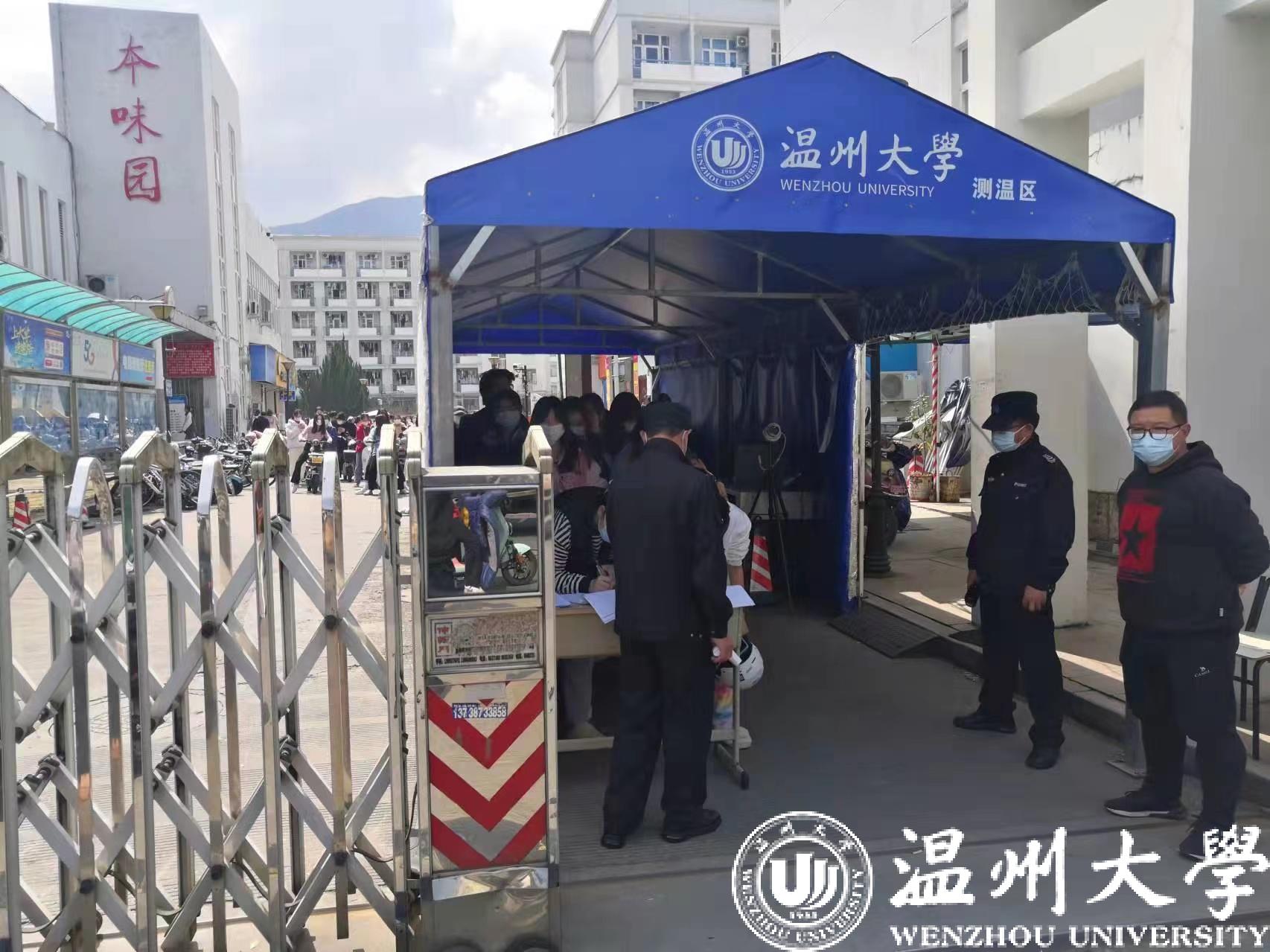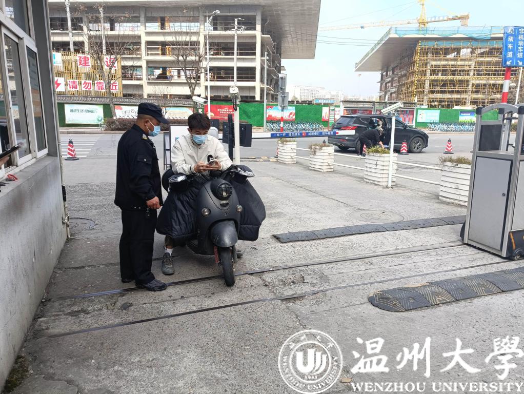 “请出示温州防疫码并测量体温进行登记。”ac米兰官网中文网站南校区东门的保卫处工作人员和志愿者正在进校检查。由于疫情防控需要,校园实行封闭管理。“老师和学生非常配合我们的工作,希望疫情早些散去。”保卫处唐队长这样说道。入校的师生们积极配合门岗管控,主动登记、测温、亮码、佩戴口罩。