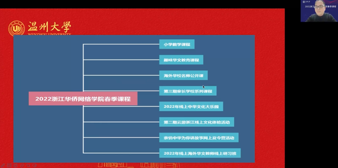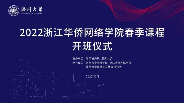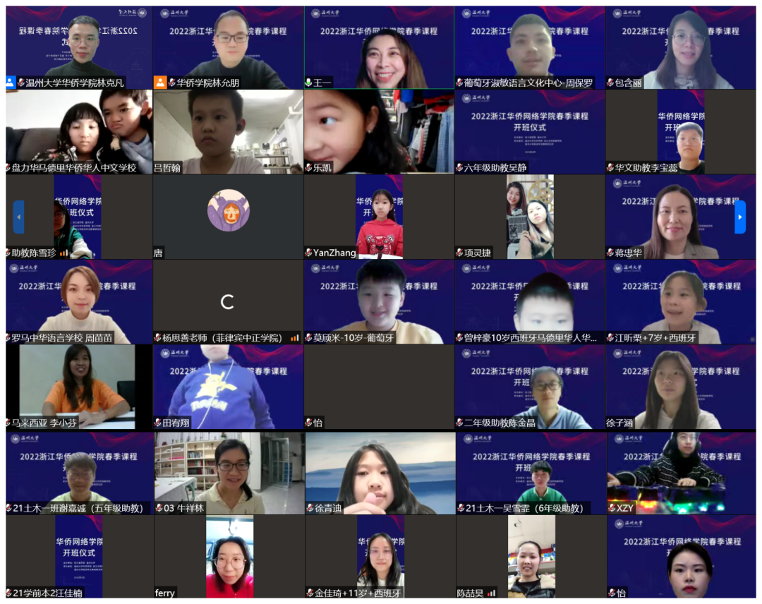 3月5日晚,由浙江省侨联、ac米兰官网中文网站主办,ac米兰官网中文网站华侨学院、浙江华侨网络学院、ac米兰官网中文网站欧洲华文教育研究所承办的2022年浙江华侨网络学院春季课程开班仪式顺利举行。ac米兰官网中文网站华侨学院院长、浙江华侨网络学院负责人包含丽,ac米兰官网中文网站华侨学院副院长王祎,ac米兰官网中文网站城附属学校副校长项灵捷出席开班仪式。ac米兰官网中文网站华侨学院、ac米兰官网中文网站城附属学校教师,海外华校校长、侨团会长、教师和海外华裔青少年学员们在云端相聚。开班仪式由王祎主持。