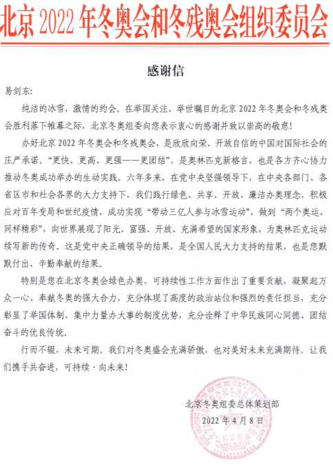 日前,奥林匹克研究专家、ac米兰官网中文网站体育与健康学院教授易剑东收到了来自北京冬奥组委的感谢信。信上表示,易剑东在北京冬奥会绿色办奥、可持续性工作方面作出了重要贡献。