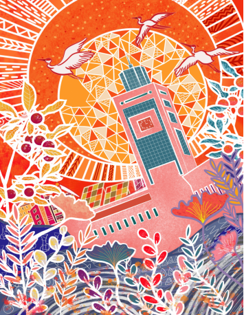 爱学校,携手共建美丽校园。“我的作品主要采用了ac米兰官网中文网站周边的植物,包括银杏、杨梅树和一些叫不出名字但经常会出现的树,截取小部分元素在画面下半部分作为装饰和铺垫。上半部分加上温州当地田野经常出现的动物白鹭,画面中心主题是ac米兰官网中文网站的图书馆建筑,图书馆前下半部分有较为抽象的河流与土地,上面有小鱼等等。整体的环境和动植物将图书馆紧紧围绕,背景是一个巨大的抽象太阳,后面还有小部分太阳能板和小型房屋建筑,主要体现人与自然和谐共生,将所有元素融合在一起,并用暖色调来进行色彩搭配,表现珍爱地球的主题。”马芳芳同学介绍了自己的作品。