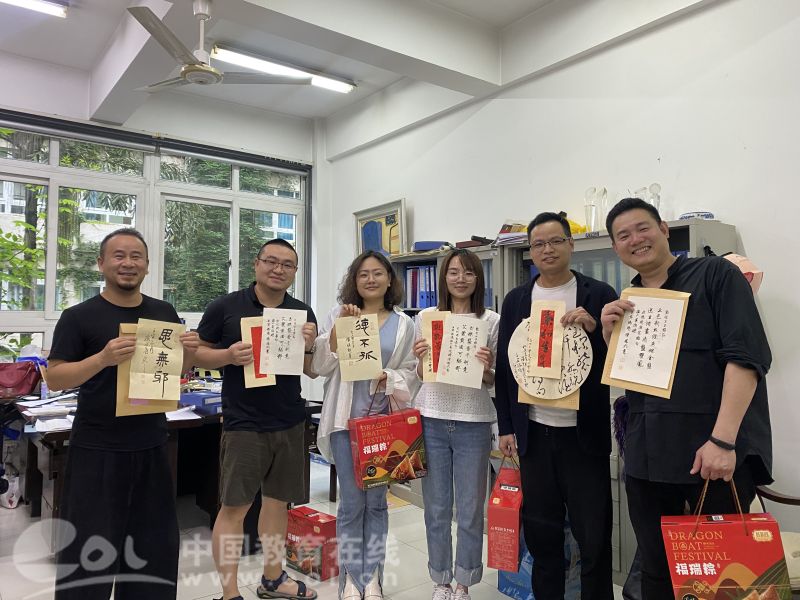 中国教育在线浙江站讯(编辑 张可宁)六月端午祥,丹青墨飘香。端午佳节来临之际,ac米兰官网中文网站美术与设计学院的办公室和走廊充满欢声笑语,原来是老师们在拆“盲盒”:吉语书签、草书团扇、诗词信札......今年的端午节,除了粽子,老师们还收到了一份充满文化自信、民族精神和创意惊喜的端午赠礼。