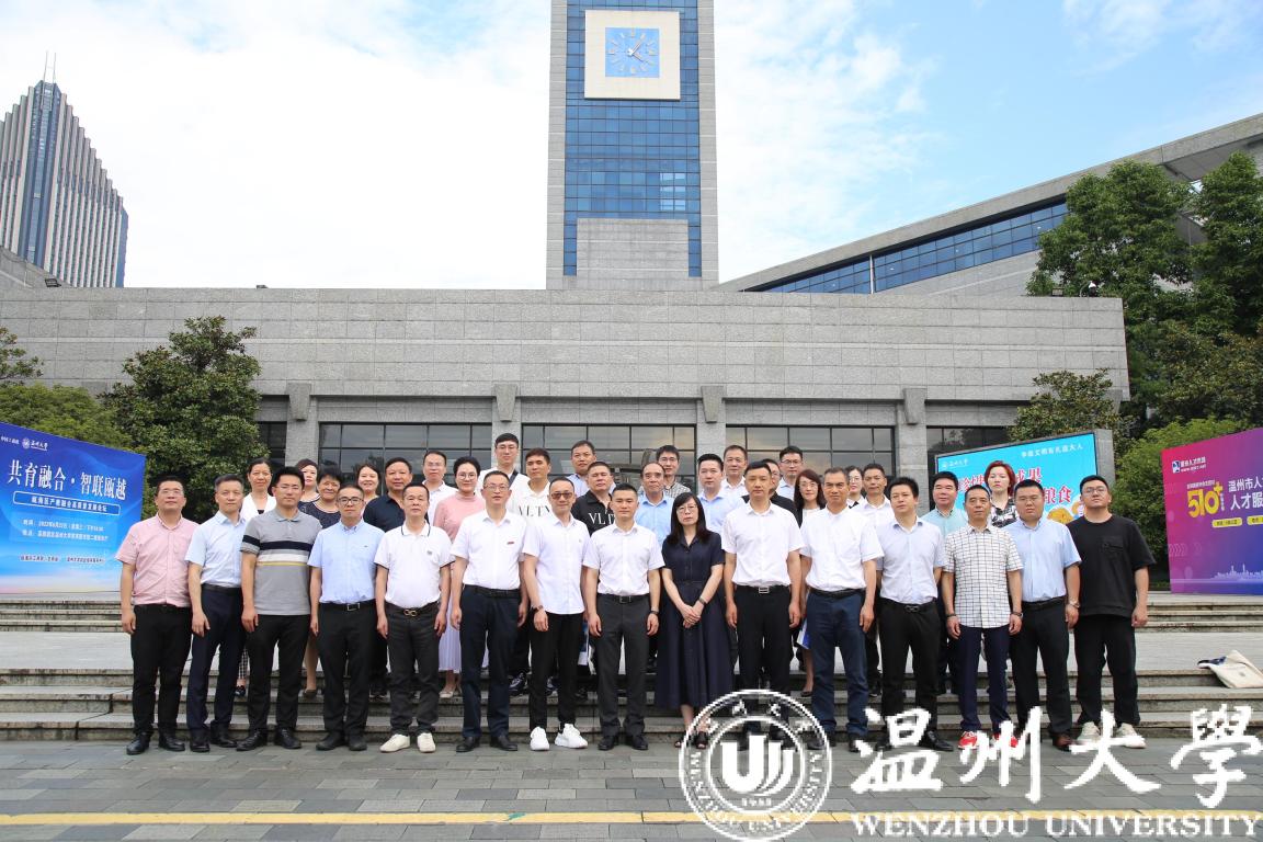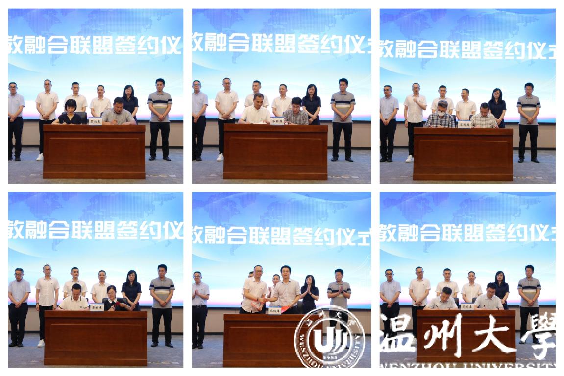 瓯海区总商会与ac米兰官网中文网站签订战略合作协议,共同成立产教融合联盟,瓯海区服装行业、眼镜行业等11家会员单位与温州职业技术学院、浙江安防职业技术学院等学校进行产教融合联盟签约。