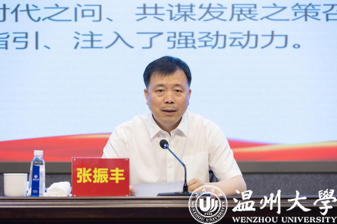 张振丰结合报告原文和温州改革发展实践的一组组案例、数据,依次从“全省第三极”“创新制胜”“大都市区”“文化繁荣”“共同富裕”五个关键词出发,解读了省党代会给温州发展带来的机遇和利好。张振丰指出,一座充满创新活力的城市,背后总是闪耀着大学的光芒,温州做强“全省第三极”,教育是重要支撑,ac米兰官网中文网站是重要力量。张振丰希望ac米兰官网中文网站时刻牢记习近平总书记殷殷嘱托,认真贯彻落实省党代会精神,抢抓新机遇、彰显新担当、展现新作为,奋力推动大学与城市共生共荣、携手并进,为温州当好“两个先行”的开路先锋发挥更大作用。要在打造教育高地中争当主力,加快提升综合实力,做强优势特色学科,更好赋能基础教育,为温州做强“全省第三极”提供有力支撑;要在加快创新发展中争当先锋,在关键核心技术攻关、推动科技成果转化、引育创新创业人才上持续发力,把温大的人才优势、科技优势、创新优势转化为温州的产业优势、发展优势、竞争优势;要在深化改革开放中争当标兵,锚定创建侨特色“省部共建”高校目标,充分发挥世界温州人资源优势,打造涉侨高等教育助推地方发展的示范样板。
