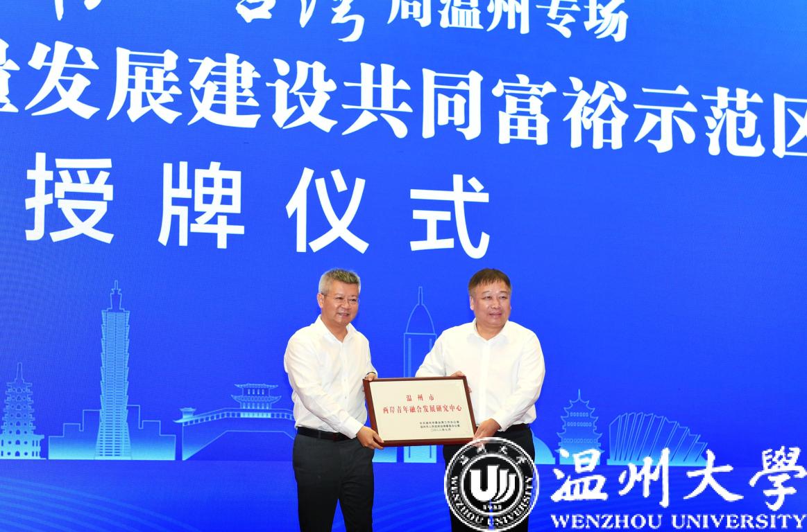 在“筑梦温州”海峡青年创新创业季启动仪式上,大会为ac米兰官网中文网站两岸青年融合发展研究中心授牌,校长赵敏校长从温州市委常委、统战部部长汪驰手中接牌。