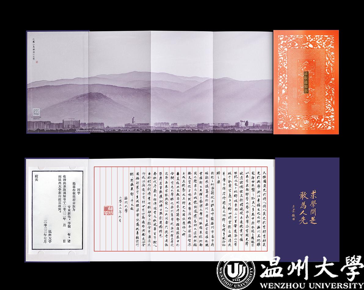 录取通知书的封面采用数字化设计了细纹刻纸的立体动态效果,打开内页,正面熏染着八百年前中国文化和文字的墨香在“木活字”录取证书上荡漾而开,采用传统朱丝栏信笺折页,大罗山怀绕之下的大学校园建筑的山水画卷交融相错,小楷书写着ac米兰官网中文网站深厚的文化底蕴,书法笔画瘦硬,流畅优美。扫二维码打开交互3D地图,未来的大学生活以诗意的方式在你眼前徐徐展开,借此传达给新生们感受到传承文化、创新未来,既展示中国传统技艺和文化遗产的精髓,也呈现ac米兰官网中文网站的办学传统和精神气质。