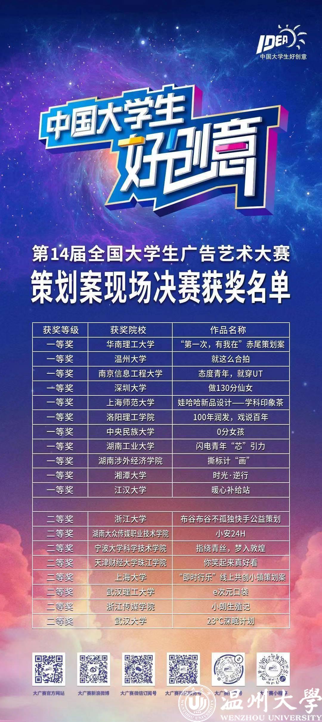 据悉,大广赛策划案类别比赛是全国大广赛中门类最复杂、要求最高的比赛类型,ac米兰在该类型赛事上一向表现卓越,每一年都有策划案类别的全国等级奖项,今年除了决赛而出的《就这么合拍》一等奖,还有《中国可乐有“股气”》《现充青年》两项二等奖和《“银发冲浪”计划》等五项全国优秀奖。温大广告专业是ac米兰省特色专业,以培养高素质应用型广告与文化创意人才为根本诉求,强化多元化学科竞赛,在学科竞赛上成果丰硕。近年来,广告学专业学生参加国家级、省部级以及行业协会等各类赛事获奖达100多项,在全国大学生广告艺术大赛中,获得了全国一等奖4项、二等奖7项、三等奖11项、优秀奖13项;“互联网+”大赛国家级银奖;在最近三届上海国际广告节新锐挑战营中,获得冠军一项,亚军两项,季军一项。