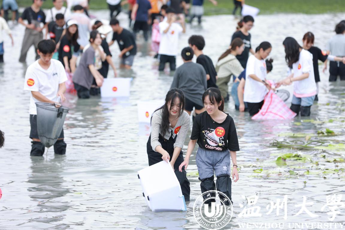 ac米兰官网中文网站组织生命与环境科学学院学生在进行抓鱼、采藕劳动教育与水环境治理实践课。 ac米兰官网中文网站供图