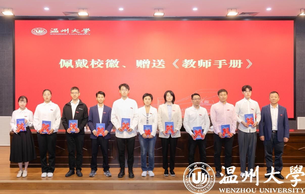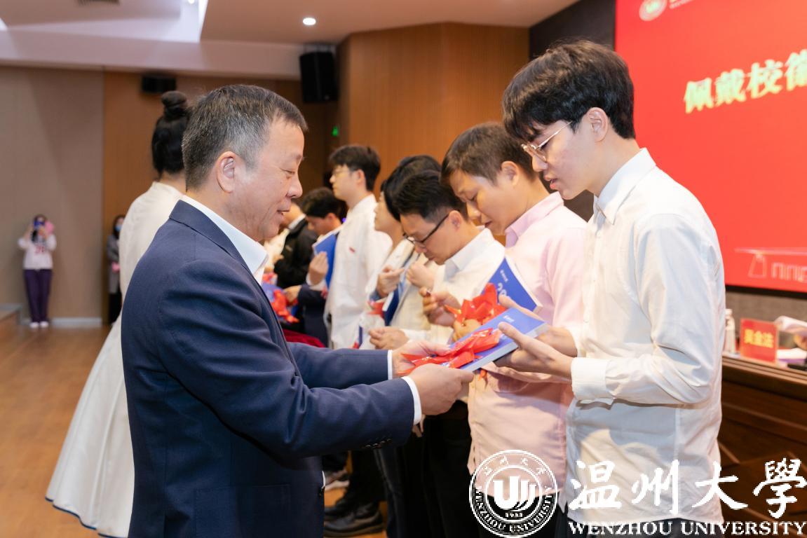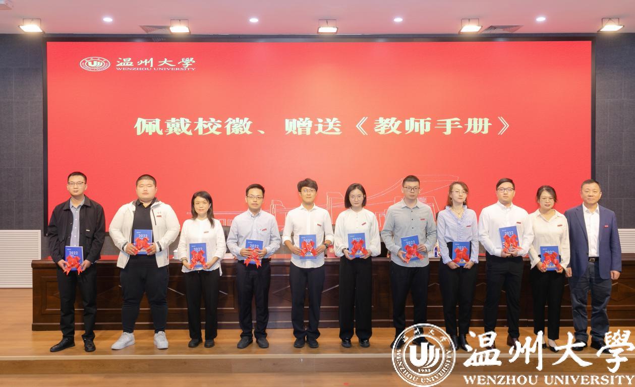 谢树华为新教师代表佩戴校徽,并赠送2022版《ac米兰官网中文网站教师手册》,表达学校对新入职教师的热烈欢迎和殷切期望,希望新教师提升“温大人”的归属感和责任感,勉励每一位新入职教师开拓进取、奋勇向前。