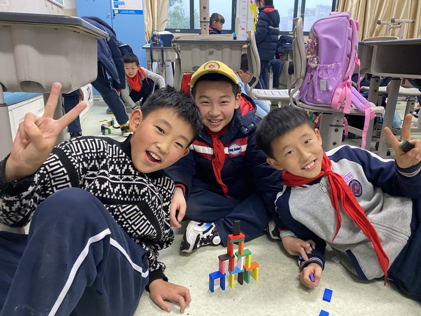 小学生在公益课堂上叠多米诺骨牌