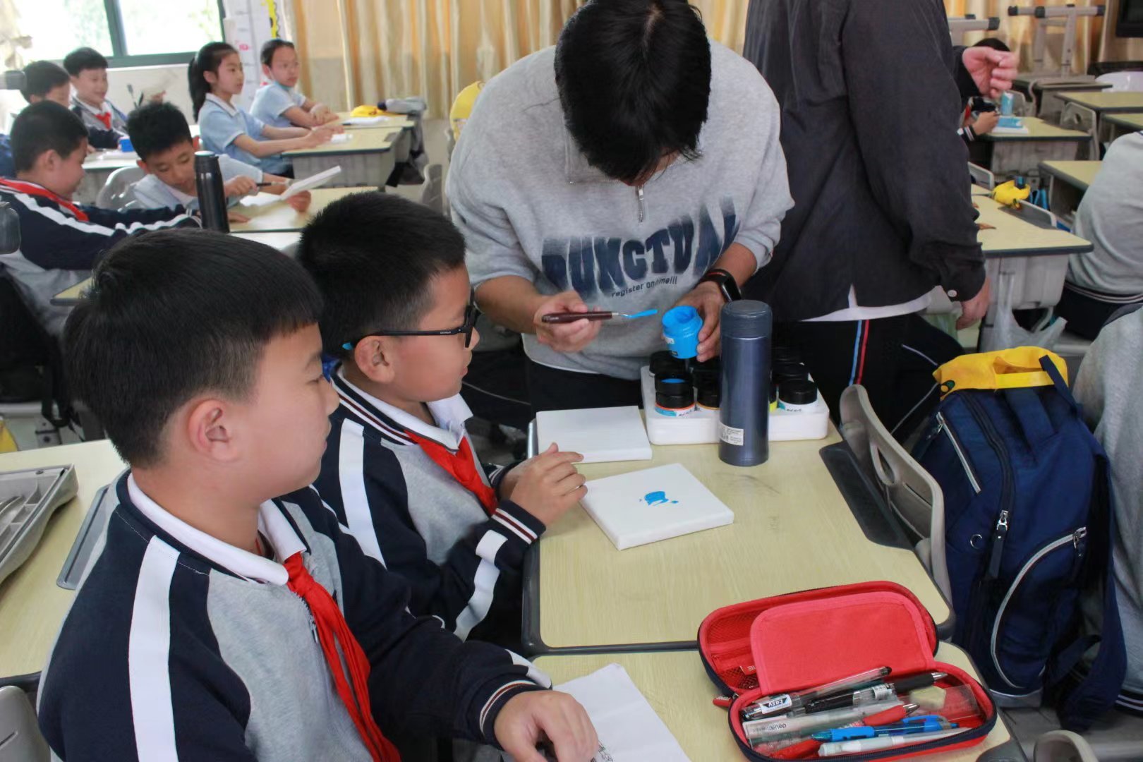 小学生在公益课堂学习肌理画