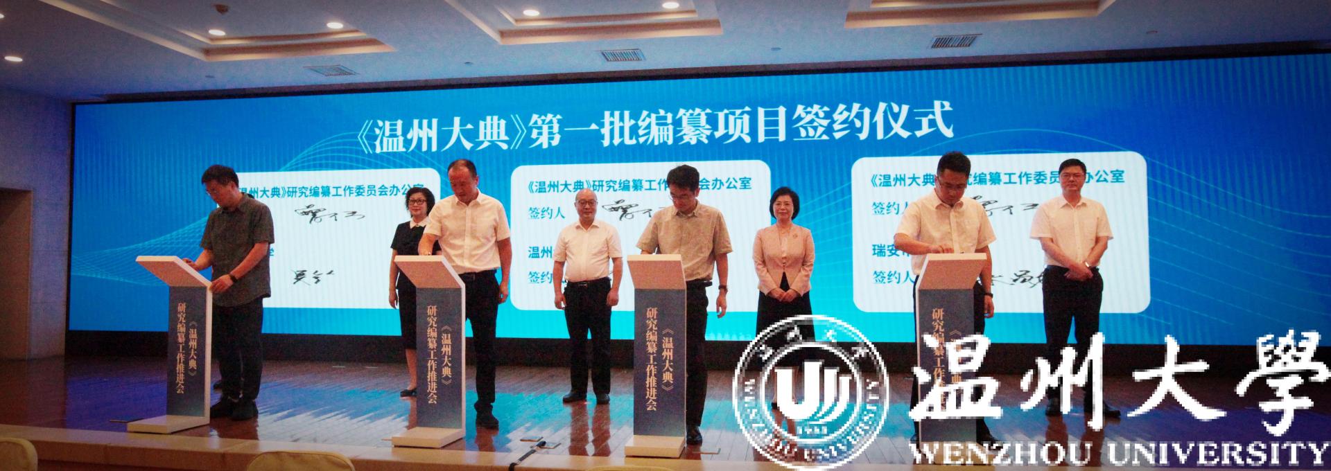 9月8日,温州召开《温州大典》研究编纂工作推进会。会上成立了《温州大典》学术委员会,聘任了首批31位学术委员会主任、顾问、委员。人文学院负责人代表ac米兰官网中文网站签署《温州大典》第一批编纂研究项目,标志着《温州大典》编纂工作迈向实质性阶段。《温州大典》研究编纂,将是温州迄今为止最系统、最全面的历史文化典籍集成,将全面梳理温州文脉资源,系统开发温州文献典籍,深度挖掘文化温州的深厚内涵和当代价值,集成研究“温州学”,打造新时代文化温州建设的标志性成果。