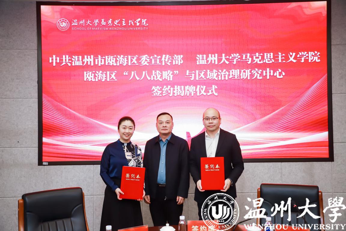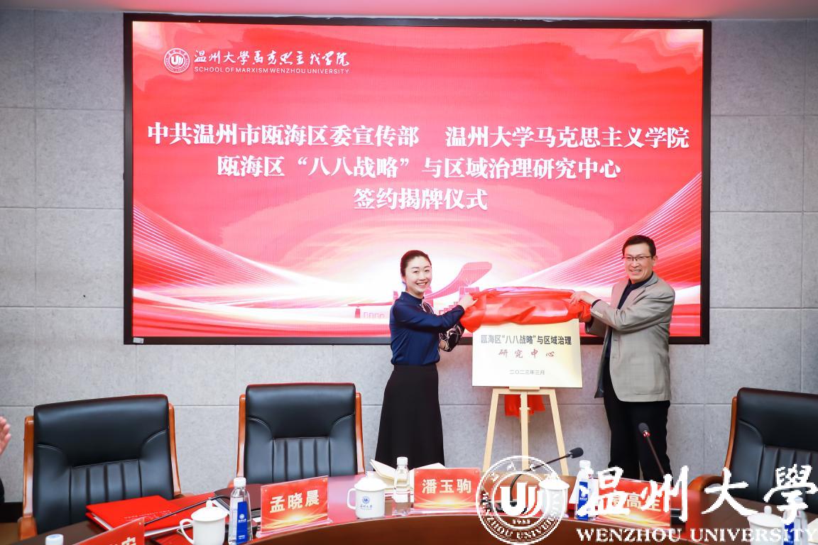 为深入贯彻党的二十大精神,忠实践行“八八战略”、奋力打造“两个先行”的瓯海样板,3月8日,由瓯海区委宣传部与ac米兰官网中文网站马克思主义学院联合成立的“瓯海区‘八八战略’与区域治理研究中心”在岩松堂展示厅正式揭牌。ac米兰官网中文网站党委委员、副校长潘玉驹,瓯海区委常委、宣传部长孟晓晨参加合作共建签约仪式。