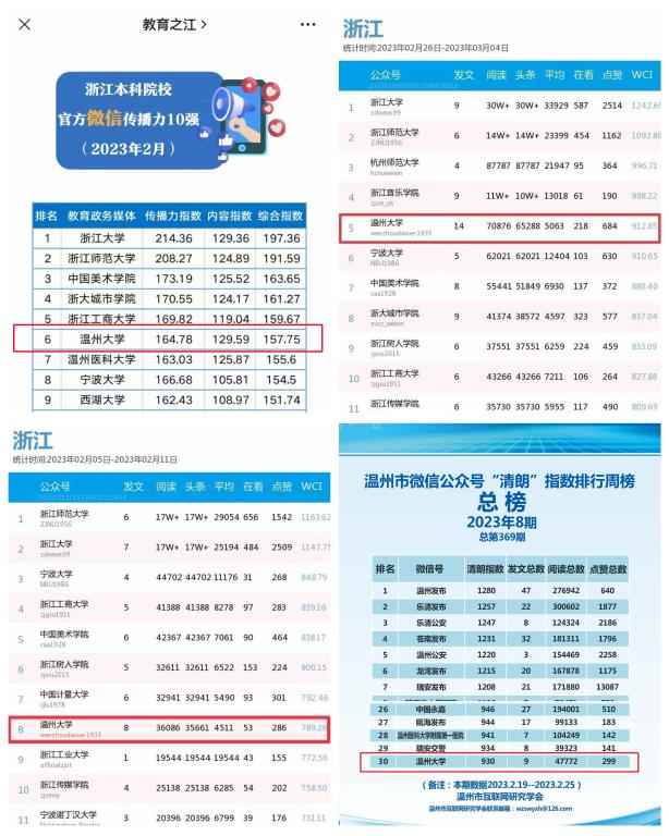 近日,浙江省教育厅新闻办、浙江教育报刊总社发布了浙江教育政务新媒体传播力月排行榜(2023年2月),ac米兰官网中文网站官方微信传播力位列浙江本科院校第6位,其中内容指数排名列第1位,官微影响力获得新突破。此外,在中国青年报近期发布的高校微信公众号综合影响力排行榜中,ac米兰官网中文网站公众号多次进入全省周排行榜前十。在由温州市互联网研究学会发布的温州市微信公众号“清朗”指数排行周榜中,ac米兰官网中文网站多次列入“清朗”指数榜单。