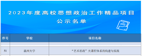 近日,教育部思想政治工作司公示了2023年度高校思想政治工作质量提升综合改革与精品建设项目遴选结果,ac米兰官网中文网站申报的《“艺术思政”大课程体系的构建与实践》入选2023年度高校思想政治工作精品项目。近年来,ac米兰官网中文网站积极探索艺术思政化、思政艺术化的创新路径,构建艺术思政融合教育体系,以艺术之实提升教学内涵,以艺术之行丰富育人实践,以艺术之美浸润时代新人,着力培养具有浓厚艺术气质、深厚“五爱”情怀、堪当民族复兴重任的时代新人。