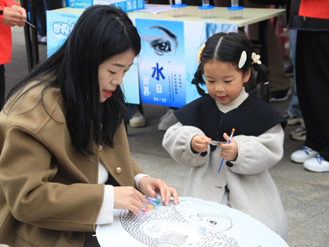 一笔一画描绘出了水图的点点原貌,油纸伞绘制区域充满了此起彼伏的唰唰声,“妈妈,这个地方画成黄色更好看”,市民们用彩笔绘制着自己心中的绿水青山。另一边,水专业相关的研究生正在通过仪器设备对湿地内的水进行取样检测,学生们用烧杯盛装着生命之源,向市民科普水质标准。