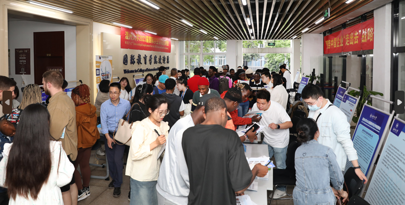 在企业招聘展位前,留学生和工作人员们热烈地交谈着,有意向的留学生毕业生纷纷填写就业申请表,工作人员也就其就职单位基本情况、工作岗位设置、薪资福利待遇、员工职业发展等方面进行介绍,其他年级的留学生也听得颇有兴致,为自己毕业后的就职方向做准备。