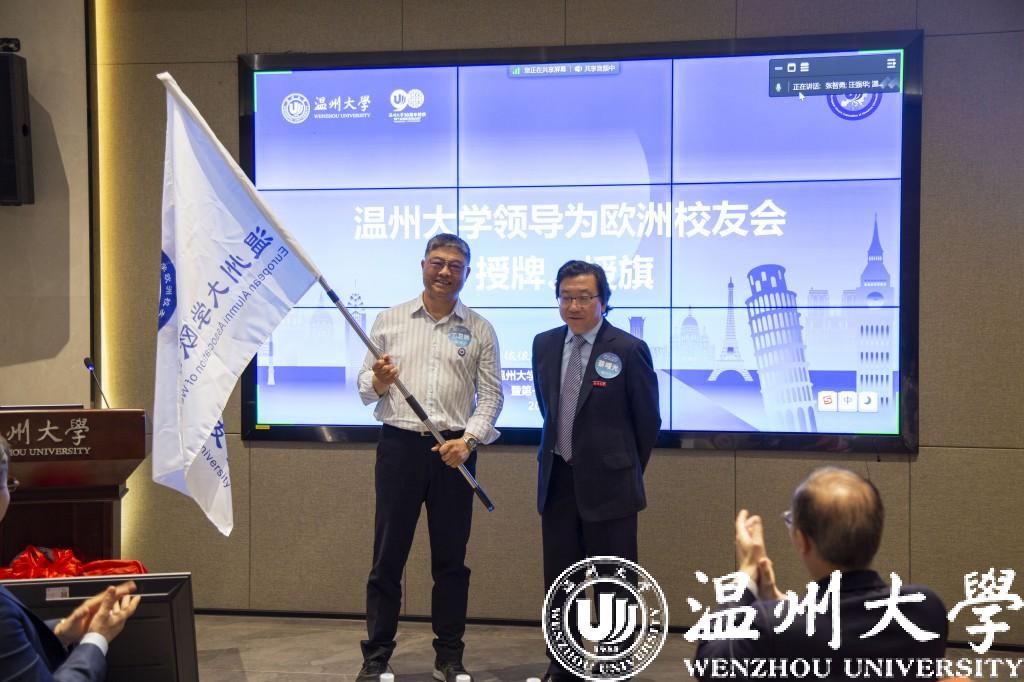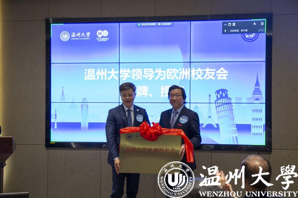 大会审议通过了《ac米兰官网中文网站欧洲校友会章程》和ac米兰官网中文网站欧洲校友会第一届理事会建议名单。蔡曙光向欧洲校友会授牌、授旗。蔡曙光、陈宏毅向欧洲校友会顾问、会长、副会长、秘书长、副秘书长、理事颁发聘书。温州校友会会长吴东、北美校友会副会长章美华上台致贺词,意大利高校联盟发起者蔡茂生线上祝贺。