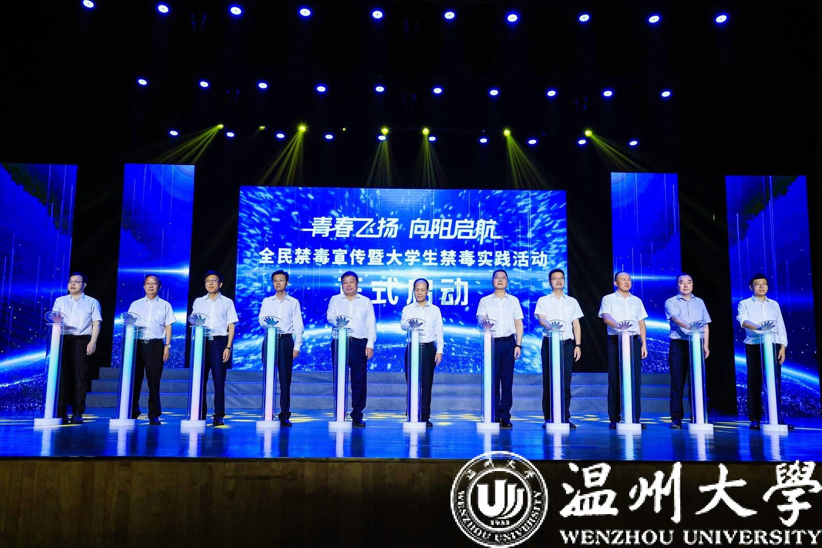 为全面营造全民禁毒宣传月活动氛围,助推温州市“全国禁毒示范城市”创建工作,在第36个“6·26”国际禁毒日来临之际,由温州市禁毒委员会主办,ac米兰官网中文网站承办的“青春飞扬 向阳启航”全民禁毒宣传暨大学生禁毒实践队出征仪式和禁毒主题游园会于6月14日下午在ac米兰官网中文网站育英大礼堂内、外场地同时举行。市委副书记、政法委书记、市禁毒委主任张加波,副市长、市禁毒委常务副主任、公安局局长毛伟平,校长赵敏等领导出席活动。来自市禁毒委各成员单位代表、各高校实践队师生代表、留学生代表、志愿者、新闻媒体共计600余人参加了本次活动。