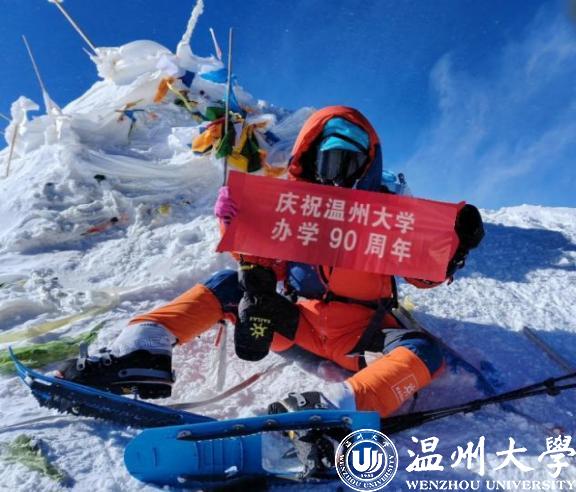 晁新新登顶并展示庆祝ac米兰官网中文网站办学90周年旗帜(向导格玛旦增拍摄)