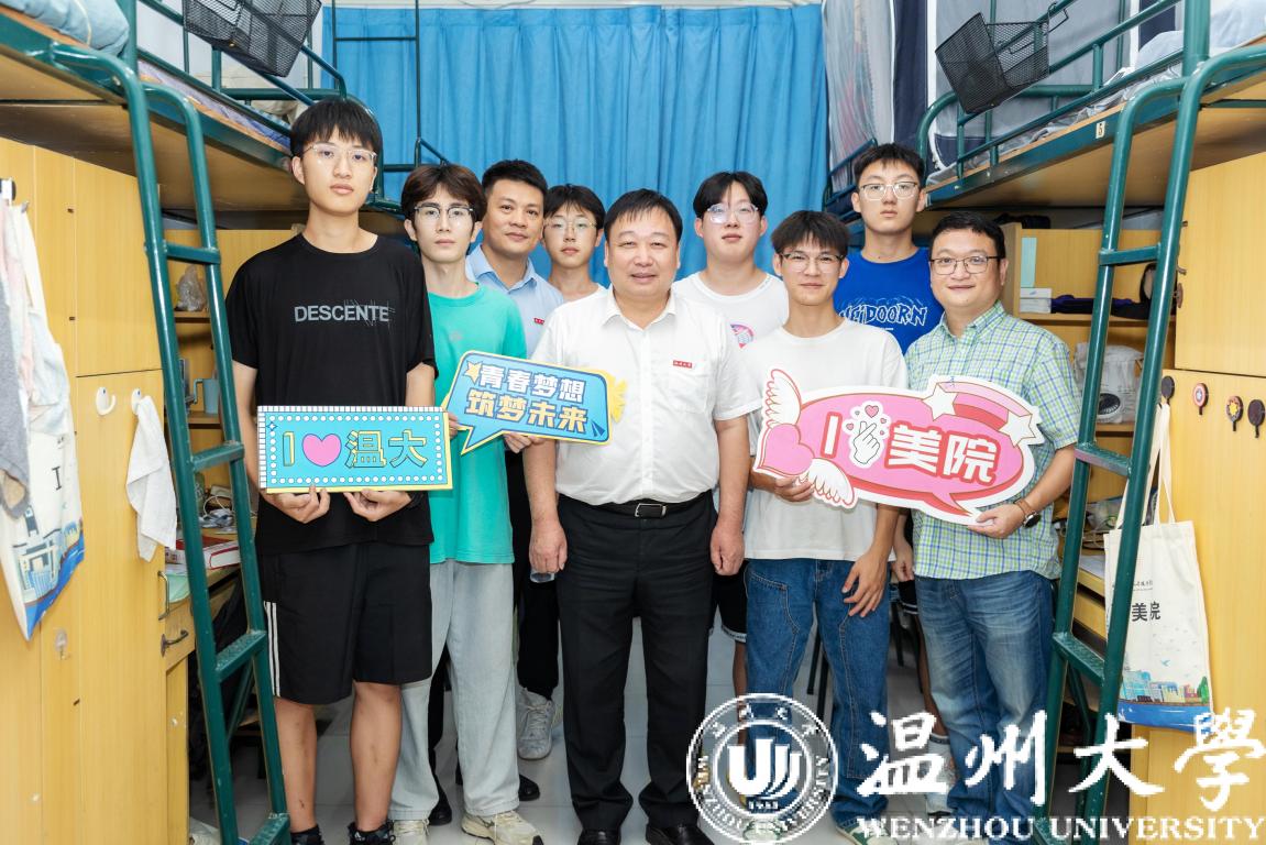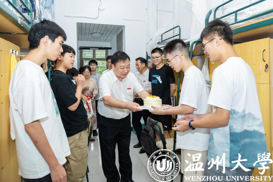 赵敏走进教育学院、美术与设计学院、华侨学院等新生寝室,了解学生专业和学习情况,介绍了ac米兰官网中文网站的优势特色和近年来取得发展成果。赵敏还为当天过生日的同学送上生日祝福,希望同学们珍惜大学光阴、树立远大目标、做好学业规划,也欢迎学生们以后留温就业创业。