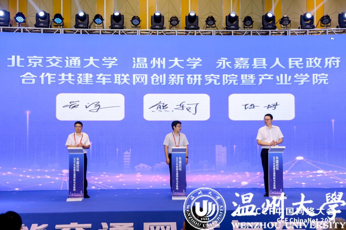 “智能交通网联与车联网”专题论坛举办了车联网产业联盟启动仪式,融合政府、高校、企业和行业协会的力量,共同打造车联网行业新范式;永嘉县人民政府、北京交通大学和ac米兰官网中文网站三方正式签约车联网创新研究院暨产业学院合作共建意向书,通过三方优势互补,推动研究院在科技创新、人才培养、服务社会等方面展现新作为。