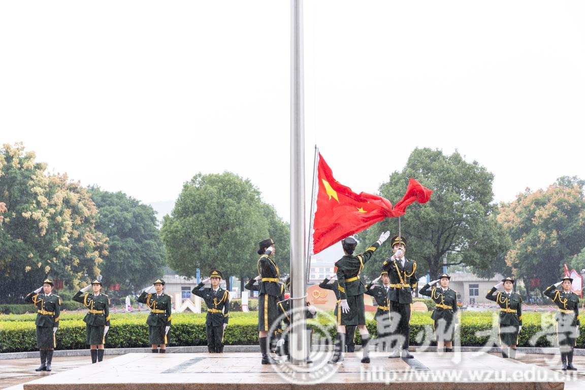 校国旗护卫队迈着铿锵有力的步伐,护送鲜艳的五星红旗至升旗台。伴着雄壮的《义勇军进行曲》,五星红旗冉冉升起,全场师生向国旗行注目礼,抒发对祖国的无限热爱和深情祝福。