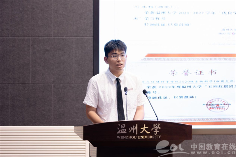 他积极向上,热衷投身于学生工作之中,也希望能够为学校、学院、班级、同学贡献他自己的微薄之力,来回报大家对他的帮助。在班级中,作为班长,他引领班级积极出色完成各项工作任务,帮助班级一举拿下校级优良学风班、温大五四红旗团支部等称号。在学院里,在任职团学部长期间,他负责学院学风建设工作,营造良好生环学风,同时对接学校素质拓展工作,带领学院荣获校级优秀工作集体、连续3次拿下优秀实拓班称号。