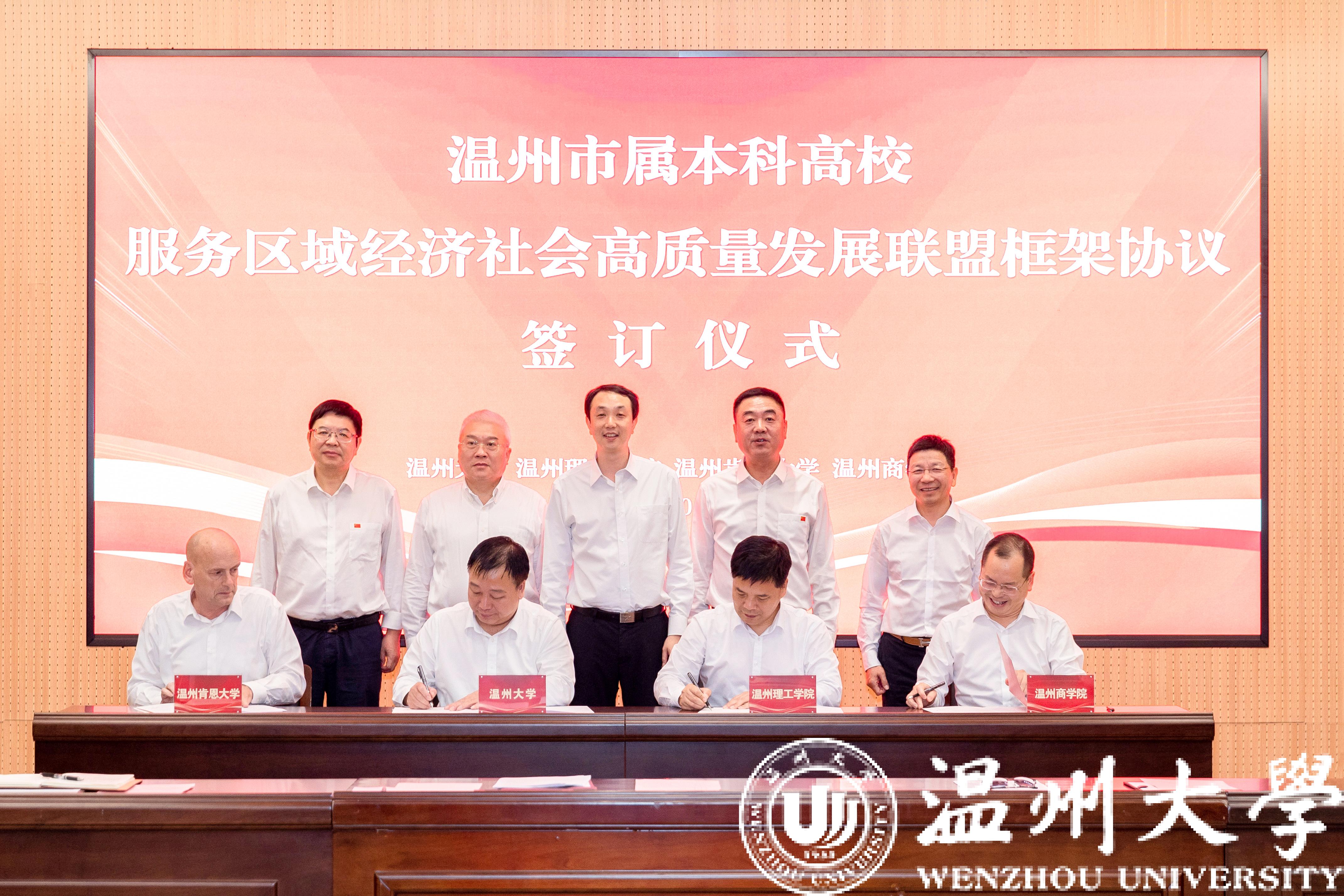在与会人员的共同见证下,ac米兰官网中文网站校长赵敏、温州理工学院校长周文龙、温州肯恩大学执行副校长安凯瑞、温州商学院执行校长赵玻共同签署《温州市属本科高校服务区域经济社会高质量发展联盟框架协议》。四所高校将在联盟框架内在师资队伍建设、干部队伍建设、学科专业建设、招生资源共享、学生工作联动、涉侨工作、办学国际化、合作平台共建、校友联络工作等方面进一步加强合作、深化交流,携手打造“千年商港、幸福温州”高等教育高地,为温州续写创新史、走好共富路提供更加有力的基础性、战略性支撑。