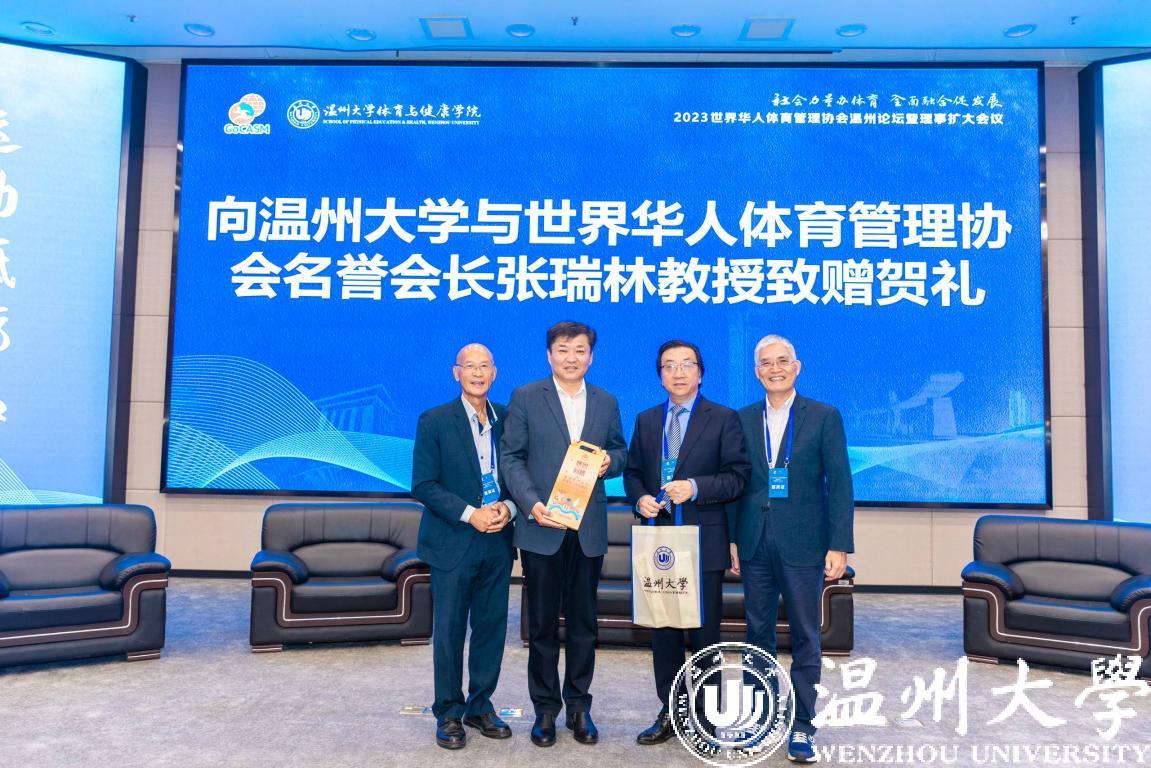 台湾体育运动管理会代表高俊雄教授,向ac米兰官网中文网站与世界华人体育管理协会名誉会长张瑞林教授致赠贺礼。