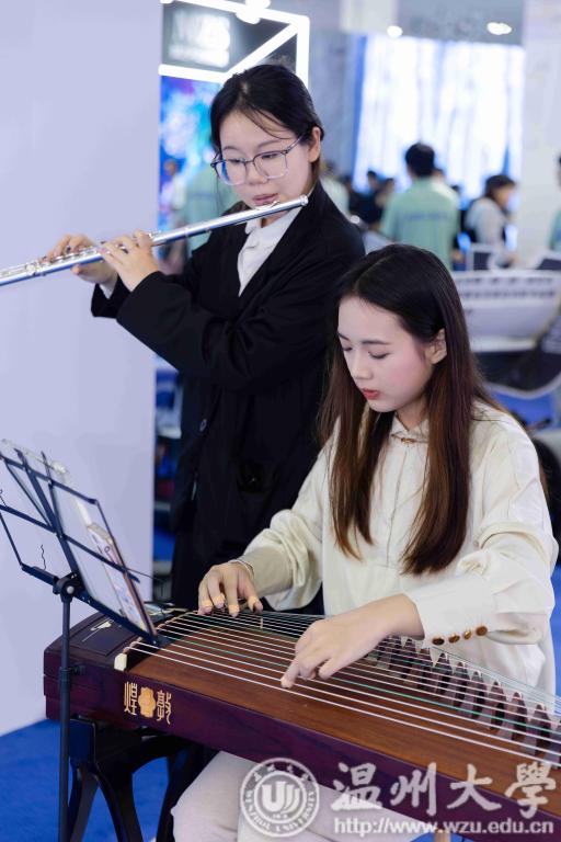 美术与设计学院的“数智”融创系列艺术设计作品,通过运用数字化工具和技术,将传统的时尚设计与现代科技相结合,呈现出独特而富有创意的艺术形式,为观众带来了全新的视觉和感官体验。现场还有来自音乐学院的学生们为市民带来乐器演奏,来自校团委的志愿者讲解员热情地为市民介绍各项目特色,展现出温大青年风采。