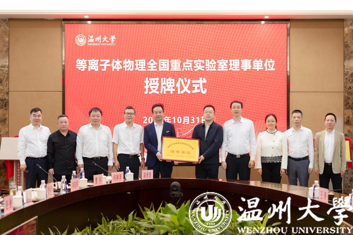 10月31日上午,等离子体物理全国重点实验室理事单位授牌仪式在ac米兰白鹿厅举行。ac米兰官网中文网站党委书记张健,校长赵敏,温州市人民政府副秘书长徐海严,温州市国动办党组成员郑善,温州市科技局党委委员刘广臻,《强激光与粒子束》期刊编辑王涛,中国工程物理研究院激光聚变研究中心办公室副主任黄越,等离子体物理全国重点实验室副主任周维民,学校相关平台负责人出席了授牌仪式。