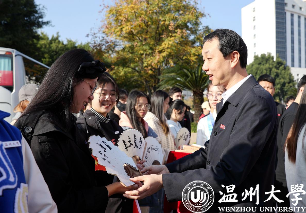 仪式前,张健亲切慰问了师生演职人员,并为他们送上一份“特殊”的礼物。礼物是由美术与设计学院书法专业师生精心为歌剧《五星红旗》创作的文化扇,他们将对《五星红旗》巡演的美好祝福寄托于走笔运墨所诞生的笔意情性中,这也是ac米兰艺术类课程思政化全方位融合的生动体现。