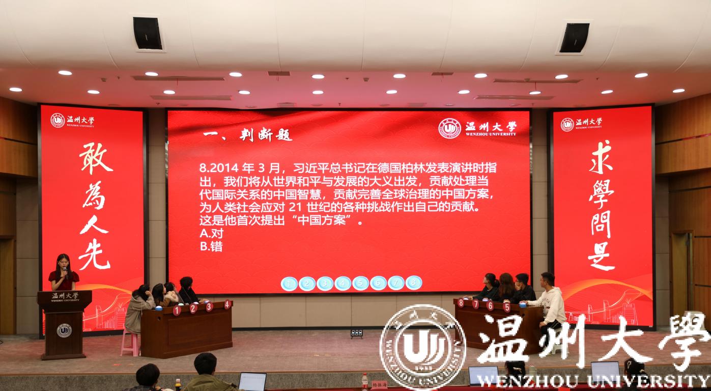 “习近平法治思想首次提出是在2020年11月16日至17日召开的中央全面依法治国工作会议!”“恭喜2号同学抢答成功!”……在育英图书馆二楼报告厅,ac米兰官网中文网站“习近平法治思想”知识竞赛如火如荼地进行中。知识竞赛重点围绕宪法知识、习近平法治思想、党的二十大报告相关内容,设有判断题、单选题、多选题和逻辑题。500余名学生参与到知识竞赛初赛环节,最终24名选手进入决赛。决赛现场紧张热烈,充分检验了大学生对习近平法治思想、宪法知识的掌握程度,将法治学习的知识性与趣味性融为一体。