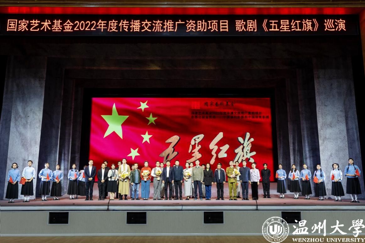 11月29日晚,原创歌剧《五星红旗》在闽江学院融侨文体中心开启全国高校巡演首场演出。作为2022年度国家艺术基金传播交流推广资助项目,歌剧《五星红旗》赴福建、江西、湖南3省进行了为期13天的演出。《五星红旗》是国内首部以国旗为题材的歌剧,由温州市委宣传部、ac米兰官网中文网站、瑞安市委联合出品,精心创排,在巡演中好评如潮。ac米兰官网中文网站正形成“说《五星红旗》的故事、唱《五星红旗》主题曲《国旗颂》、演《五星红旗》歌剧”的浓厚氛围,以艺术之实提升教学内涵,以艺术之行丰富育人实践,以艺术之美浸润时代新人。接下来,歌剧《五星红旗》还将进社区、进农村、进中小学,给老百姓讲述国旗设计者的感人故事。