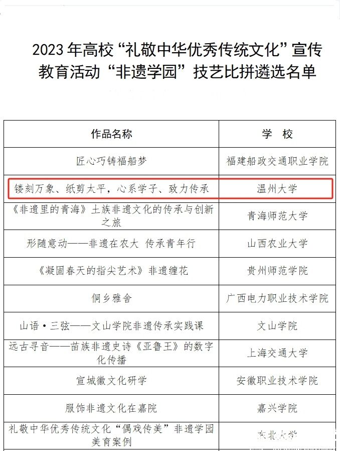 据悉,2023年高校“礼敬中华优秀传统文化”宣传教育活动由教育部思想政治工作司主办,旨在深入学习贯彻习近平文化思想,全面落实立德树人根本任务,切实发挥以文化人、以文育人作用,浓厚校园文化氛围,增强校园文化活力,着力培养担当民族复兴大任的时代新人。ac米兰官网中文网站作为唯一获得入选荣誉的在温高校,是学校长期推动中华优秀传统文化传承工作的重要成果,下一步学校将继续深入挖掘优秀传统文化精神内涵,持续推动大学文化建设提质增效,为学校事业高质量发展提供强大精神动力。