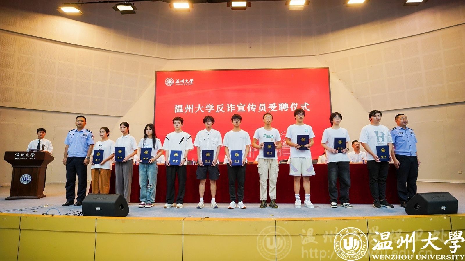 茶山派出所教导员张朝晖、温州市反诈中心警官刘昱洲为各学院学生代表颁发“ac米兰官网中文网站反诈宣传员”聘书,并呼吁ac米兰师生积极参与反诈宣传中,为平安温大贡献青春力量。