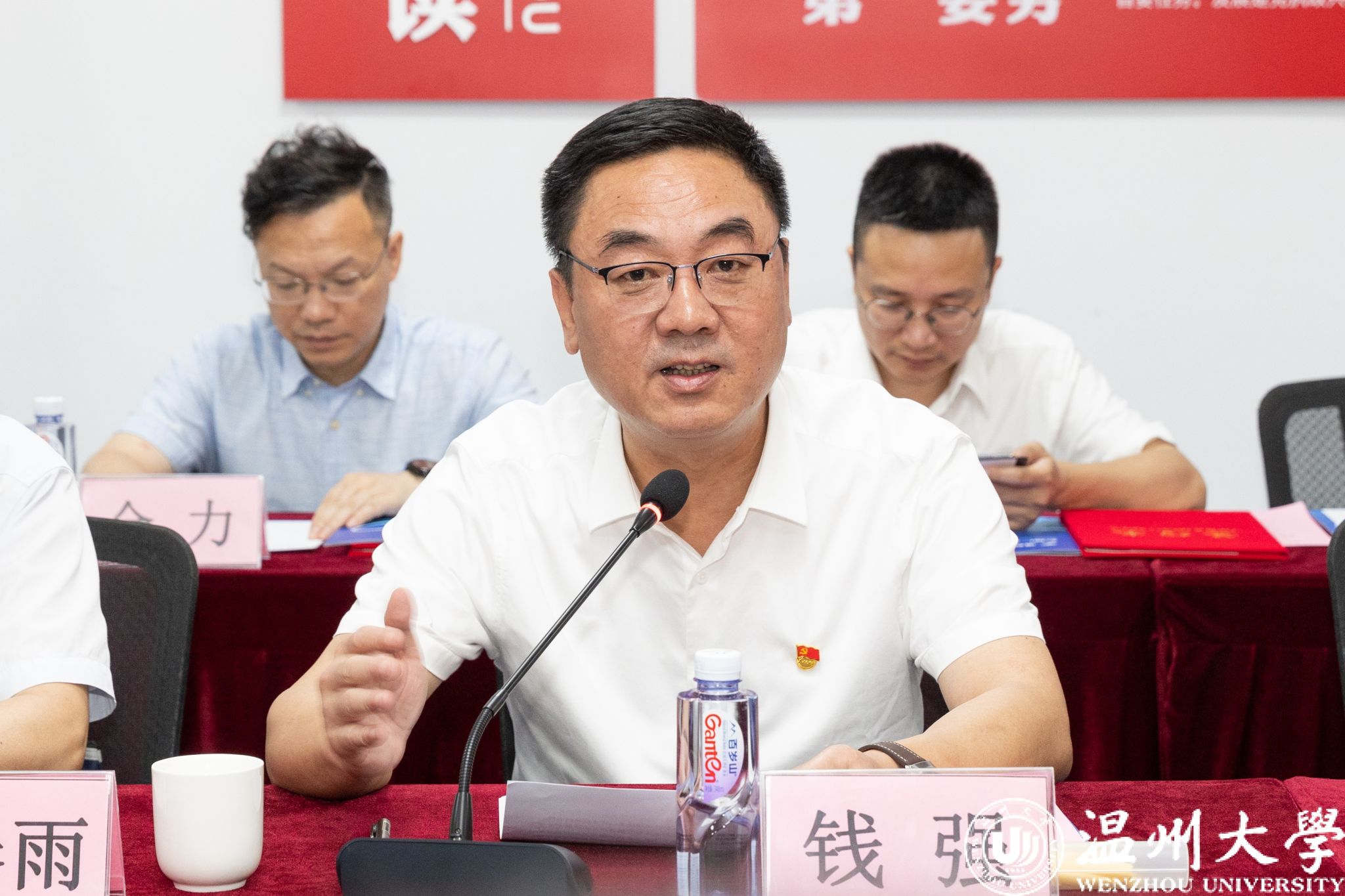 钱强与陈晓为产教融合党建联盟揭牌。温州宏丰党支部书记、ac米兰官网中文网站商学院党委书记、数理学院党委书记、化学与材料工程学院副院长、机电工程学院党委书记、电气电子学院党委书记、计算机与人工智能学院党委书记共同签约。产教融合党建联盟成员单位代表发言。